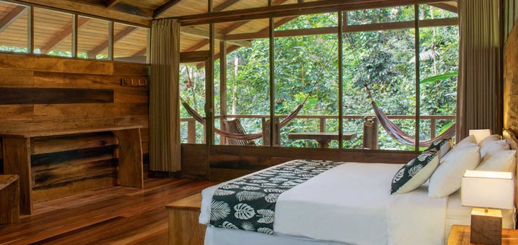 The canoe docks by the Balsa Lounge, a thatched structure with a small bar and combination of al fresco dining and comfy chairs to relax and gaze over the lagoon. This is also the access point to the captivating blackwater lagoon pool – a floating ‘cage’ on the lagoon surface that allows guests to cool off in the water without any unwelcome visitors! A series of boardwalks lead away from the lagoon and into the forest, where the main restaurant and bar are first located, followed by the accommodation.