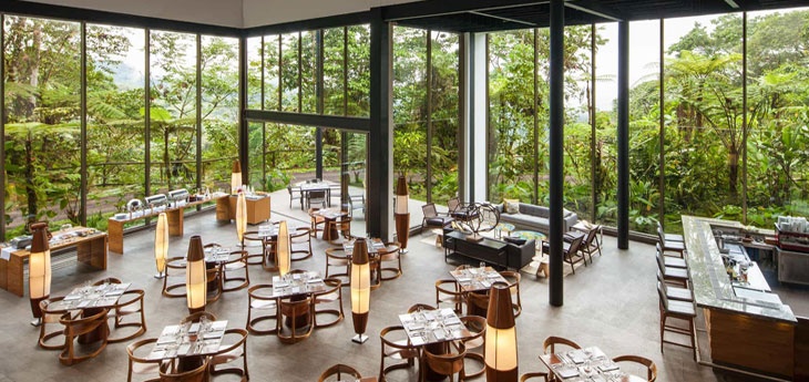 One of the most striking elements of Mashpi’s contemporary design are the floor-ceiling, wall-to-wall windows that wrap nearly the entire lodge. This provides masses of natural light and brilliant jungle views from any spot. Spare a thought from the window cleaner…keeping windows this clean in the middle of a humid forest is very much a Sisyphean task! The restaurant is particularly impressive, with windows seemingly stretching up into the forest canopy.