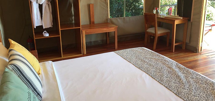 Scalesia Galapagos Lodge has 16 tents, 12 of which have twin beds and four feature a king bed. Each tent is on a raised platform, elevating it away from the forest floor. The total footprint is 53m2 (570ft2), of which just under half is the wrap-around decking. The spacious tents are well equipped with ample closet space, a desk and fan and chairs on the decking. The huge bathrooms feature a free-standing, glass-panelled shower.